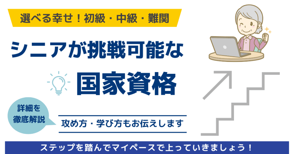 60代からの資格挑戦を応援。国家資格を「取りやすい」「中級」「難関」に分けて紹介し、自分に合ったレベルから挑戦できます。 -